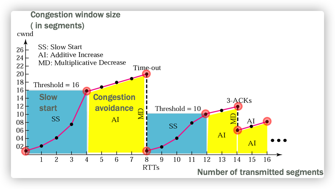 • 超时:ssthresh降为原来的一半,窗口 cwnd = 1,执行慢启动过程