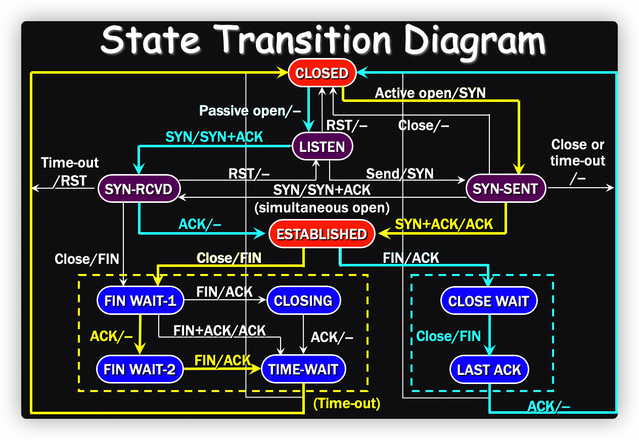 • 在客户端发送回复服务器FIN的ACK时会开启Time-waited计时器,等待两个MSL时间后关闭。